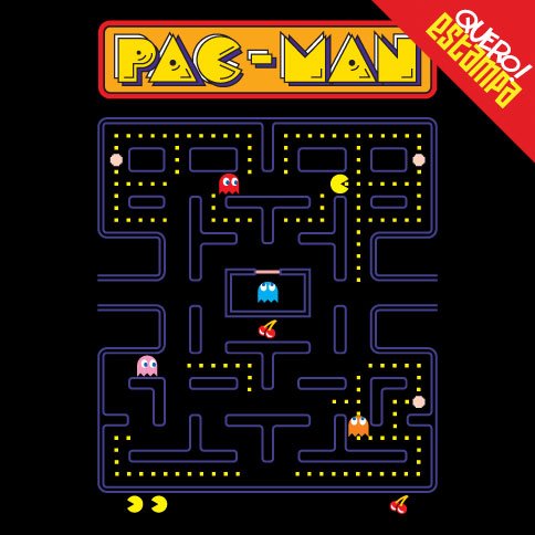 Camiseta meia manga, cor preto, 100% algodão, fio 30.1, penteada 175g, com costuras duplas na gola e ombros. Estampa “Pacman Arcade”.